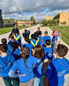• una parte pratica, durante la quale è stato allestito, all’interno dell’area scolastica, un percorso che simulava una sede stradale cittadina, con incroci, rotatorie e attraversamenti pedonali. Qui i bambini si sono alternati nei ruoli di ciclisti e pedoni, mettendo in pratica quanto appreso e imparando a rispettare le regole del Codice della Strada.