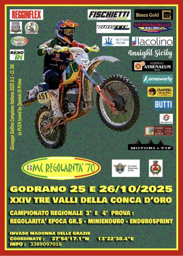 Sabato 25 e domenica 26 ottobre torna l’appuntamento con il Campionato Regionale Regolarità Gr.5, Minienduro ed Enduro Sprint. La terza e quarta prova di questa attesissima stagione si svolgeranno a Godrano, nel cuore della Sicilia, offrendo due giornate all’insegna dello sport e dell’adrenalina.